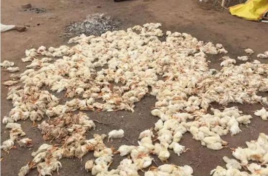 死去的鸡苗被清理出来后,倒在了院子里。