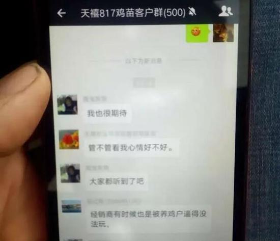 接着双方不欢而散,再打电话厂家那边也不接了。在厂家和老孙家人的聊天记录里,记者看到,双方在一个有着500人的鸡苗客户群里相互指责起来。而厂家一方竟然称管不管看我心情好不好。