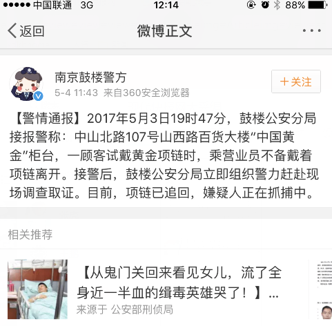 晚上八点左右,鼓楼公安分局接到报警后,立即组织警力赶赴现场调查取证。目前,项链已追回,嫌疑人正在抓捕中。 山西路百货大楼工作人员称警方已经抓捕到嫌疑人,目前警方尚未确认。