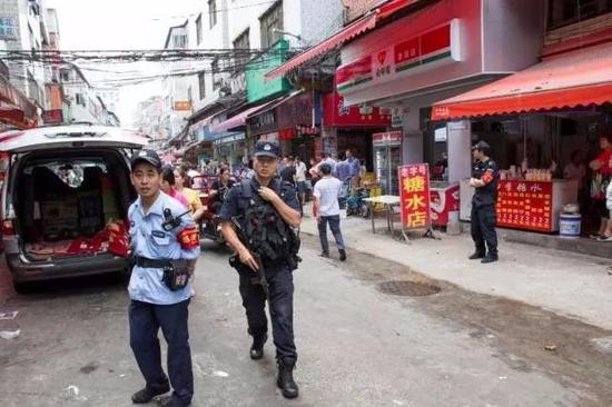 7时28分,广州110报警服务台接到群众举报,称在南洲桥南新街有一男子持刀伤害一名男孩,且涉事男子已逃离现场。