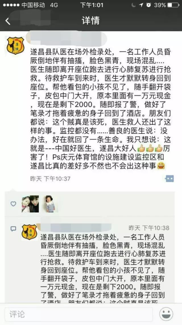 市民吴建平就在朋友圈内写下心声:“医者仁心,为救人医生钱被偷,但他毫不在乎,还说救人值,为这位好医生点赞的同时,医院及有关部门也应给予好医生适当的奖励。不要让救人者受损失,让好人难做。公安机关要抓紧破案,争取早日抓到小偷。”