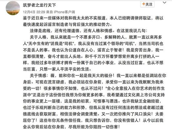 昨日(12月4日)晚间22:29,黄有龙突然就收购万家文化事件首度公开发声,公开护妻,并首次公开否认自己是某领导的司机。黄有龙海表示,自己“缺乏金融经验”、“从没有过任何违法的想法或者越过道德底线去获取财富”。