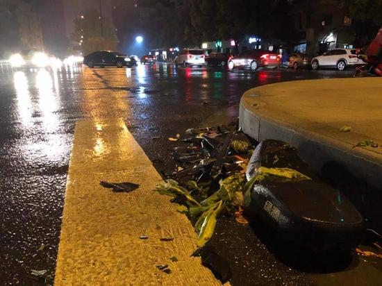 在丰潭路北向南莲花街的路口,路中央的绿化带旁,留着一堆电动车的零部件和一把深色的格子雨伞,一块汽车的底盘护板脱落在地。