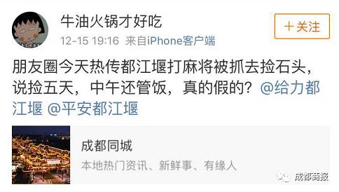 画面中,一群人聚集在泥坝上,一女子正“告诫”大家:千万不要再打麻将了!并称都江堰50岁以上打麻将会被处罚到河边捡石头…