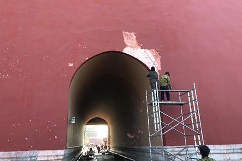 故宫表示,因为冬季气温较低,不适宜古建筑墙面施工,故暂不进行抹灰操作,只做刷浆处理,以保证墙面的整体观感协调。待到适宜施工的季节,再按照传统修缮做法重新铲抹刷浆。