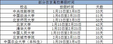 北京有至少3所高校的寒假时间超过了50天,分别是中国政法大学、中央戏剧学院和北京师范大学。