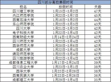 在目前统计的四川高校中,四川理工学院以47天的寒假位居榜首,放假天数最少的是成都理工大学。