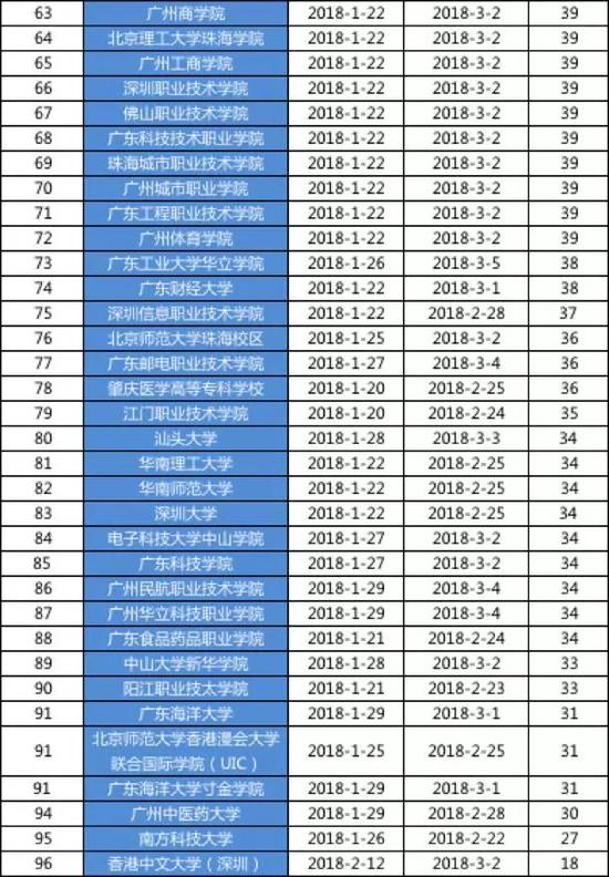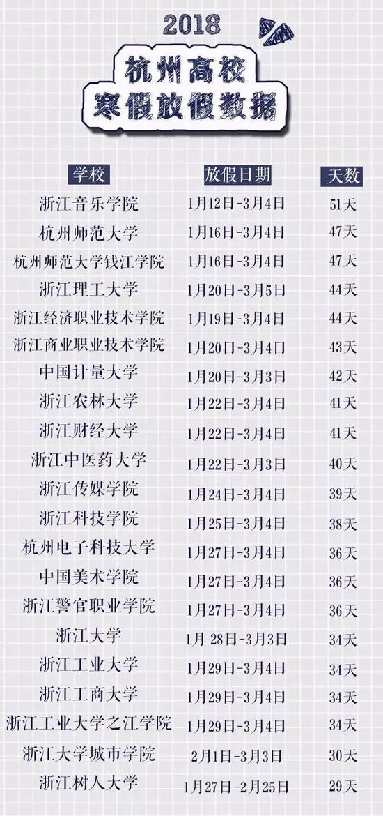 浙江音乐学院以最早放假和最长假期占据榜首,收假最早的学校是浙江树人大学,2018年2月25日开学。