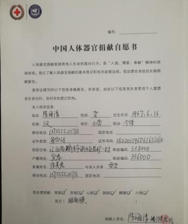“我自愿捐献:肾脏、肝脏、心脏、肺脏、胰腺、小肠。”28日下午,在中国人体器官捐赠自愿书上,徐美君和徐树平代替陈海清对每一个捐献选项都打了勾,还在“其他”后面填写了“眼角膜”三个字。
