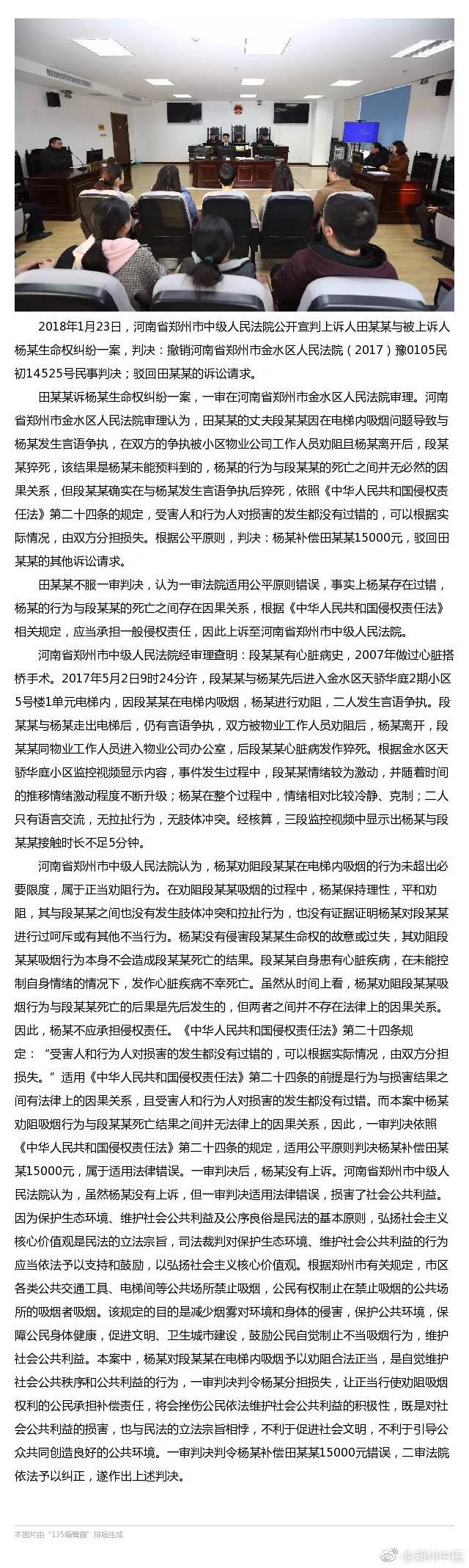 1月23日,备受全国关注的“电梯劝烟猝死案二审在河南郑州市中级人民法院驻经开区综合审判庭二审公开宣判,法院驳回死者家属田女士的诉讼请求,一审中判决被告人杨先生补偿田女士1.5万元的判决结果也被纠正。