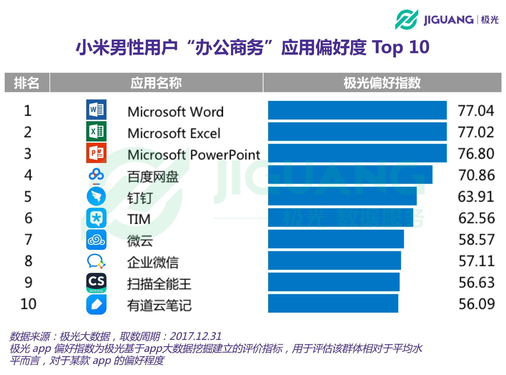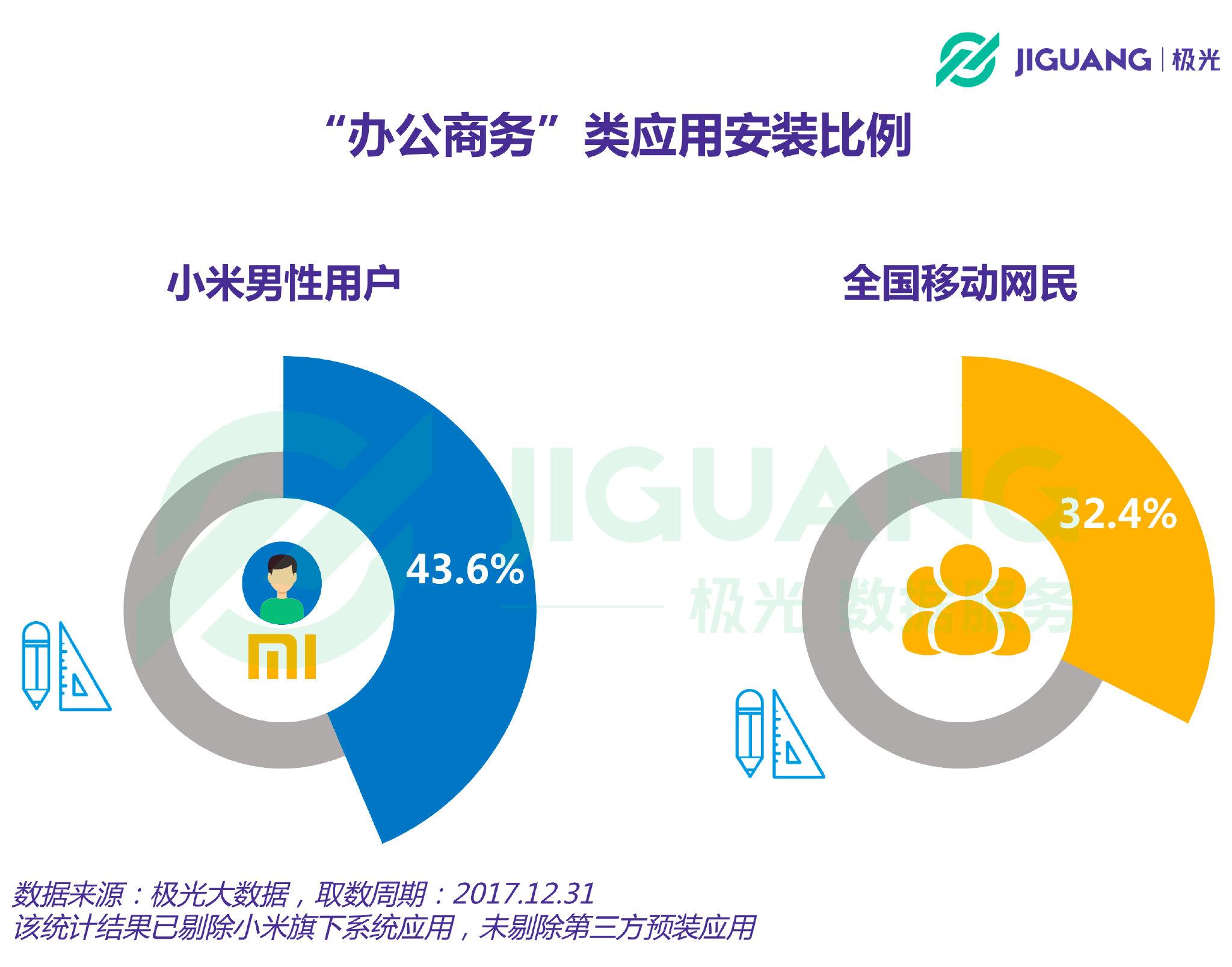在“办公商务”类应用上,小米男性用户的安装比例也显著高于全国移动网民。按照极光大数据的统计结果,“办公商务”类应用在小米男性用户的渗透率达到43.6%,比全国移动网民高出11.2%。