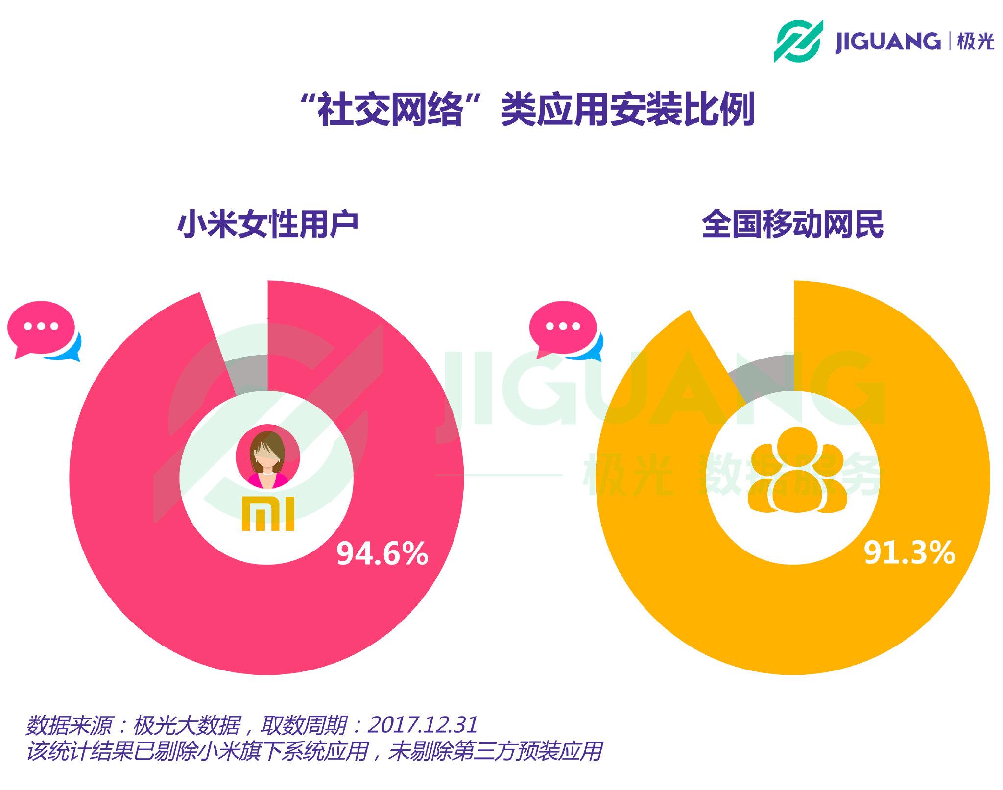 在“社交网络”类别应用上,小米女性用户的安装比例为94.6%,略高于全国移动网民的整体水平。
