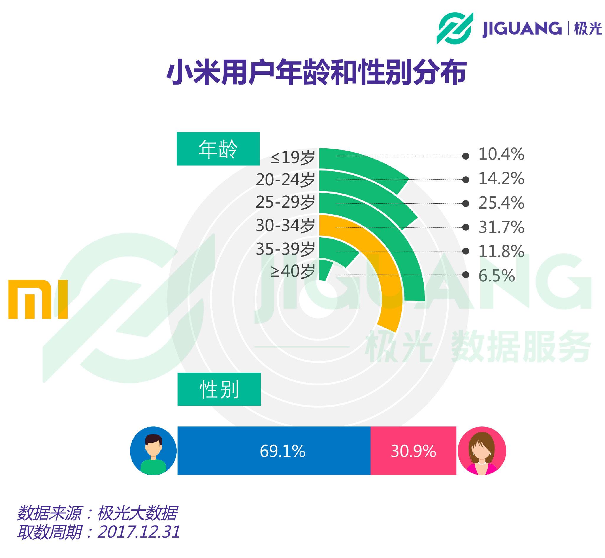 在小米用户中,男性所占的比例要显著高于女性,达到69.1%。小米用户年龄集中度最高的区间为30-34岁(31.7%),其次为25-29岁(25.4%)。30岁以上用户在该群体中占比达到50%。