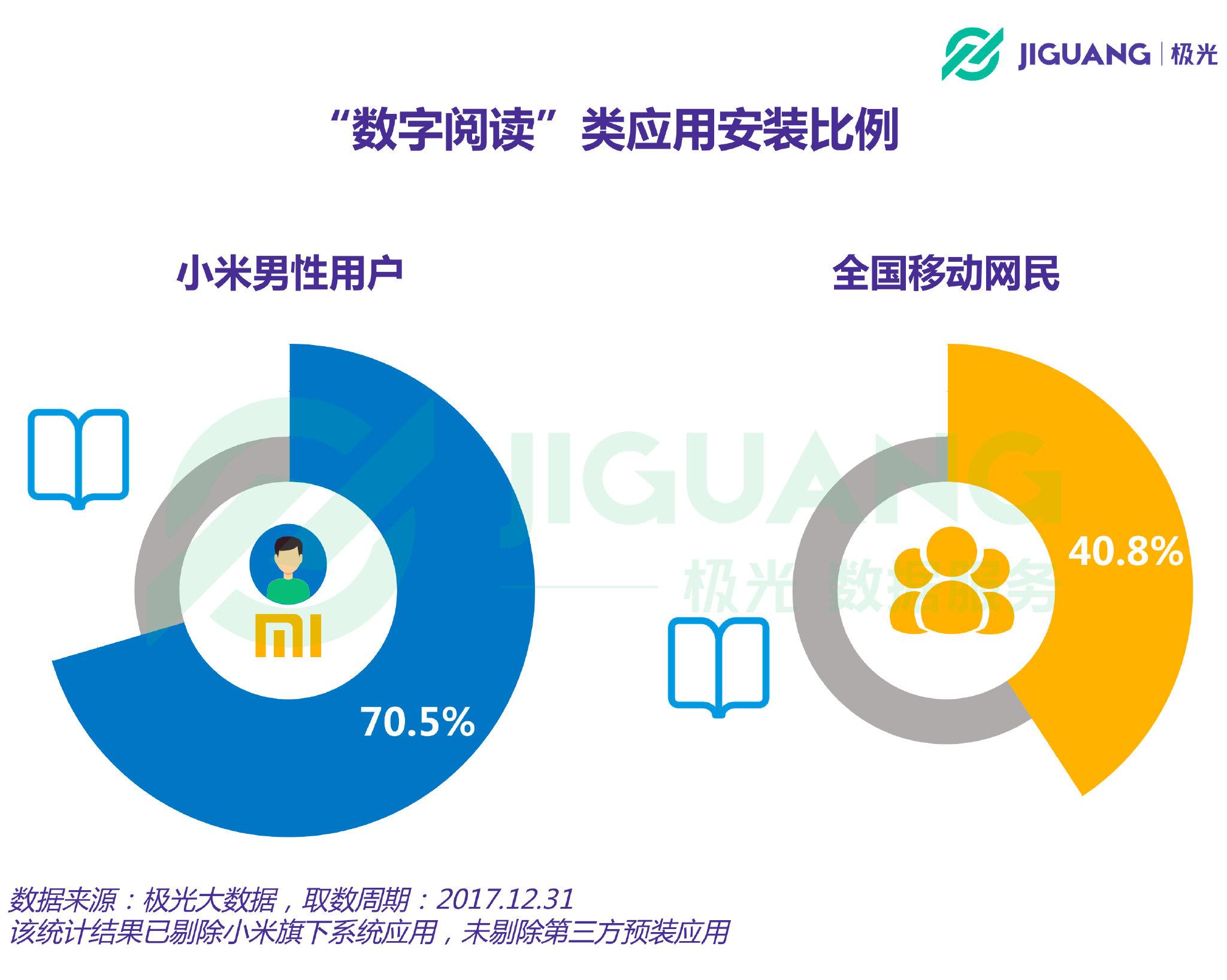 根据极光大数据的统计结果,小米男性用户对“数字阅读”、“办公商务”和“新闻资讯”这三个类别应用的安装比例要显著高于全国移动网民。差距最为显著的一个类别,“数字阅读”类应用在小米男性用户中的渗透率达到70.5%,比全国移动网民高出29.7%。