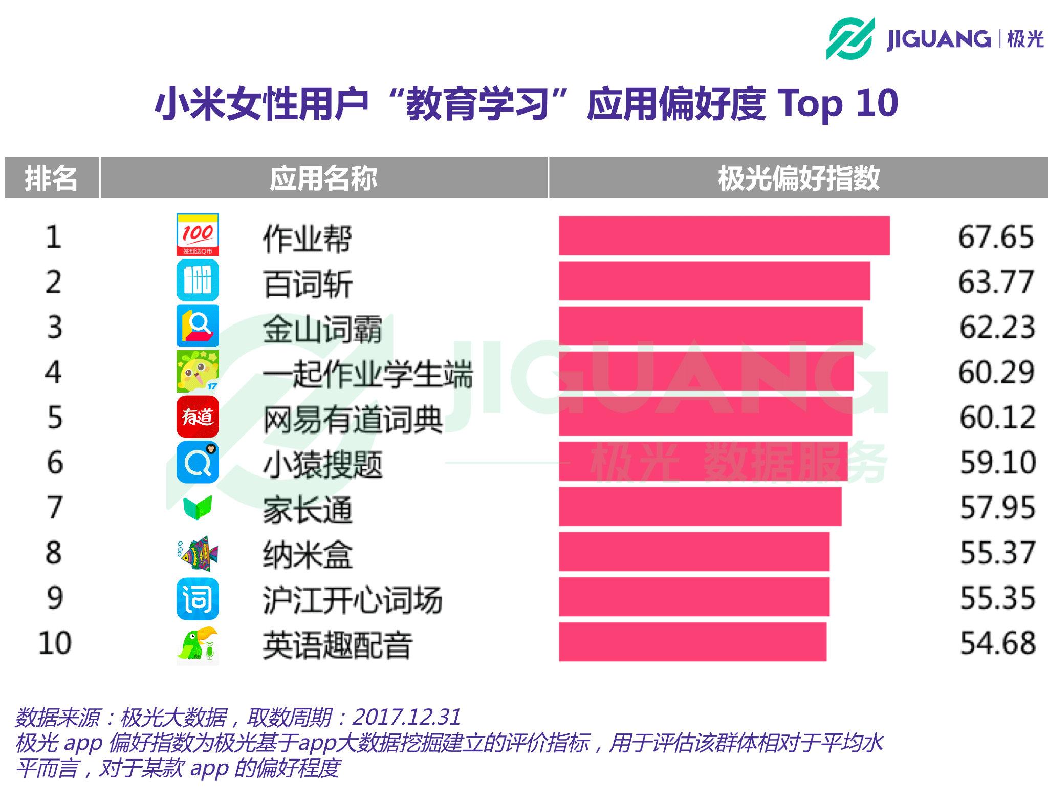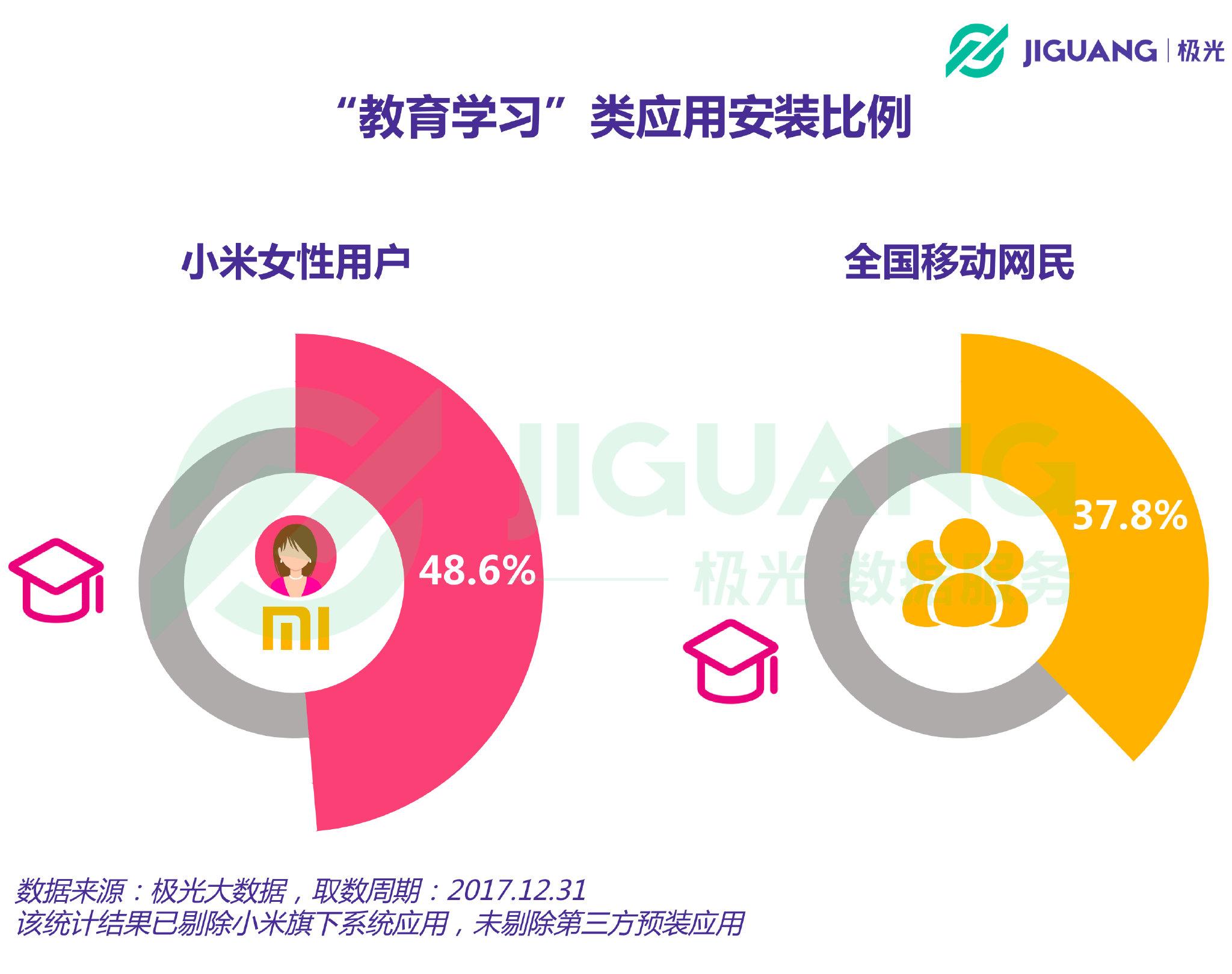 在“教育学习”类别应用上,小米女性用户的安装比例为48.6%,而全国移动网民则为37.8%。