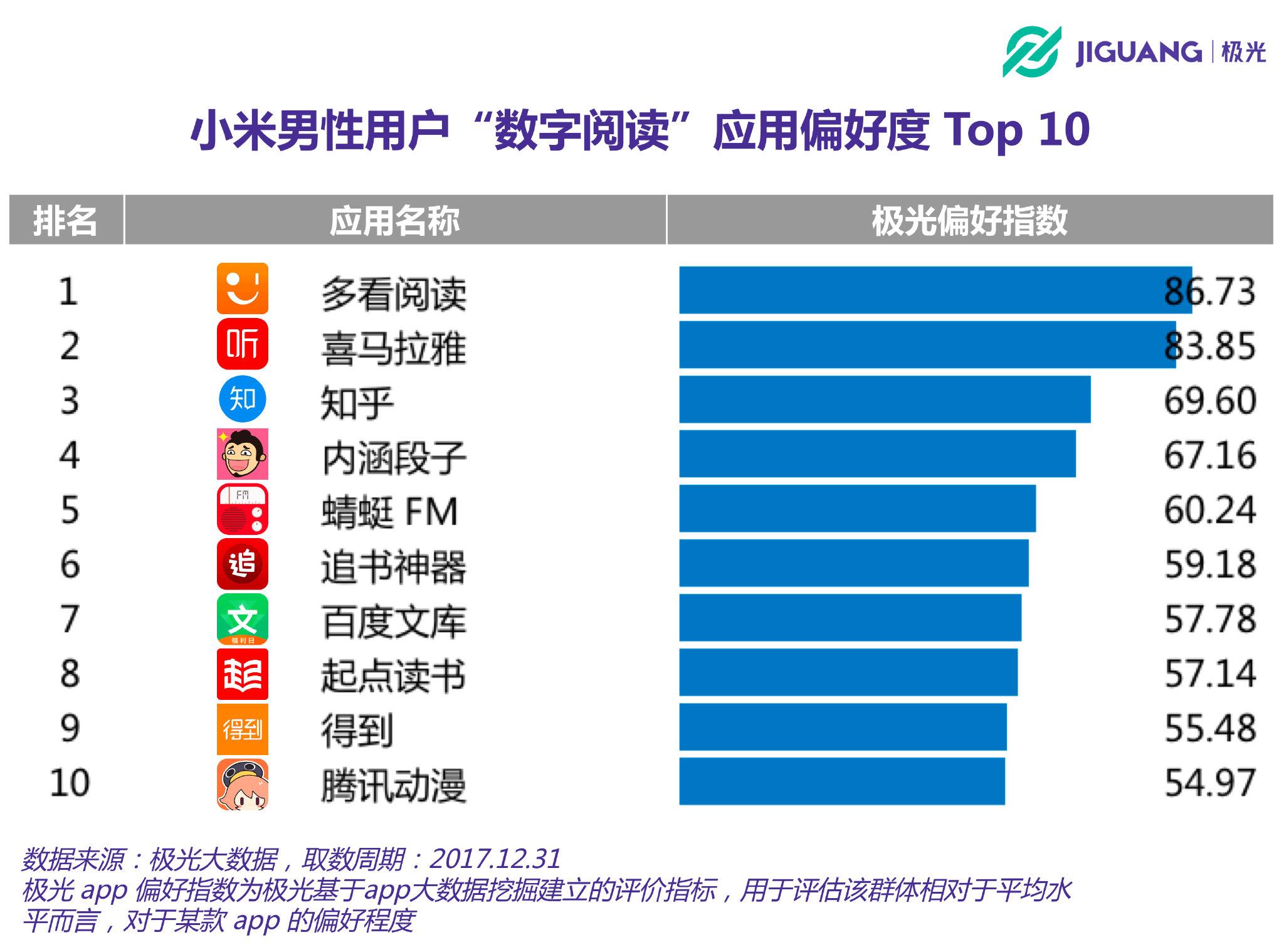 除了有合作关系的多看阅读和喜马拉雅外,小米男性用户偏好度最高的是百科问答平台知乎,偏好指数达到69.6。此外,小米男性用户对内涵段子和蜻蜓FM也表现出了较强的偏好。