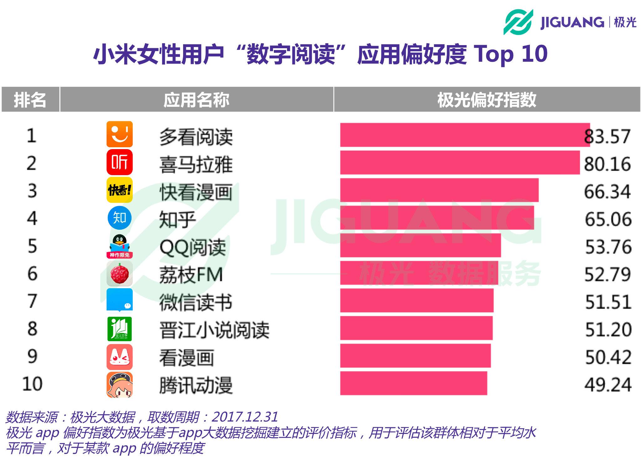 除了存在合作关系的多看阅读和喜马拉雅外,小米女性用户最偏好的是漫画阅读平台快看漫画,紧接其后的分别为知乎和QQ阅读。