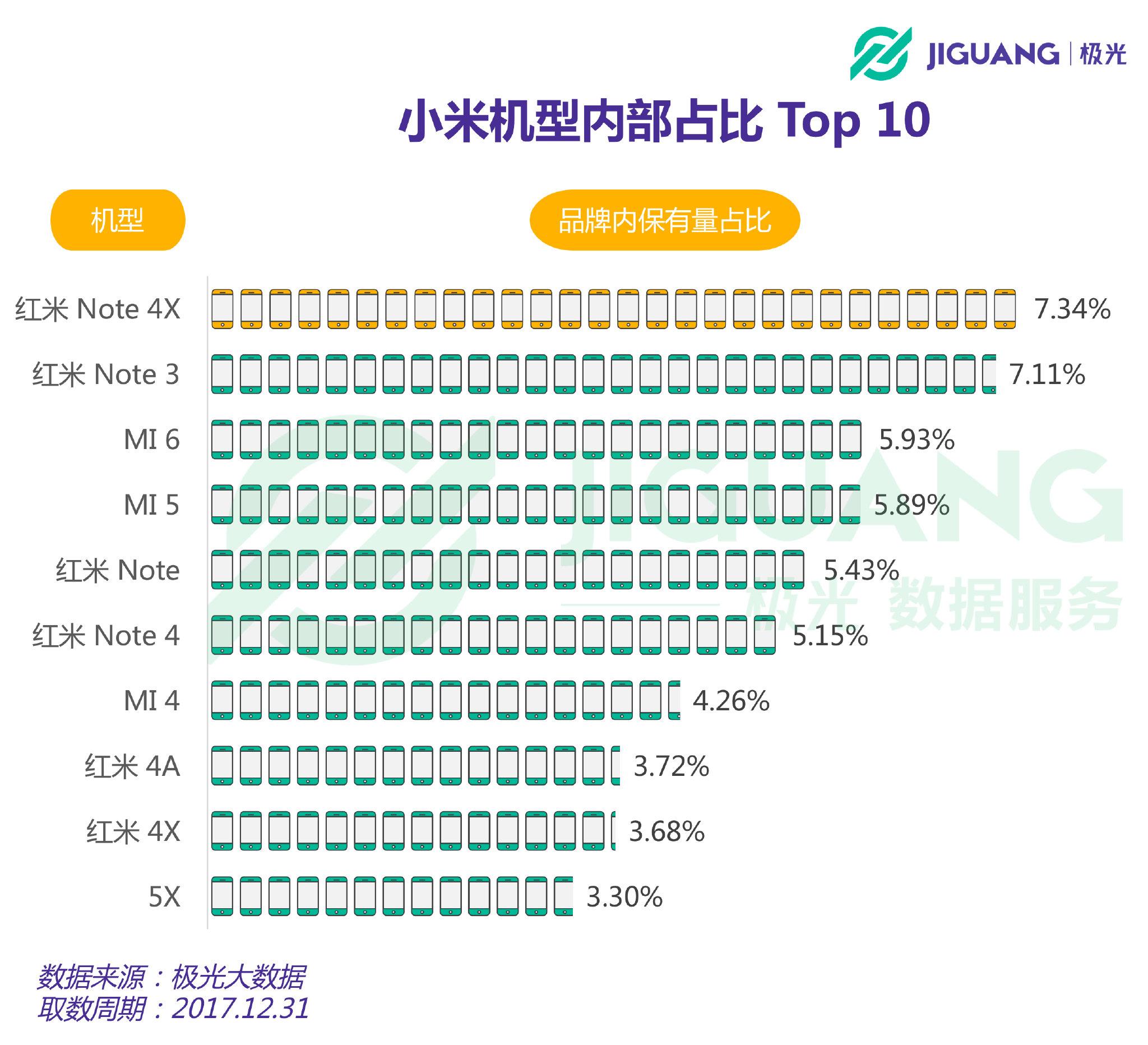 极光大数据的统计结果显示,截至去年12月,小米品牌内部分布中占比最高的机型为红米Note 4X,所占比例为7.34%。跟随其后的依次为红米Note 3和小米6,二者的占比分别为7.11%和5.93%。在小米品牌内,排名前十机型的合共份额占比达到51.81%。