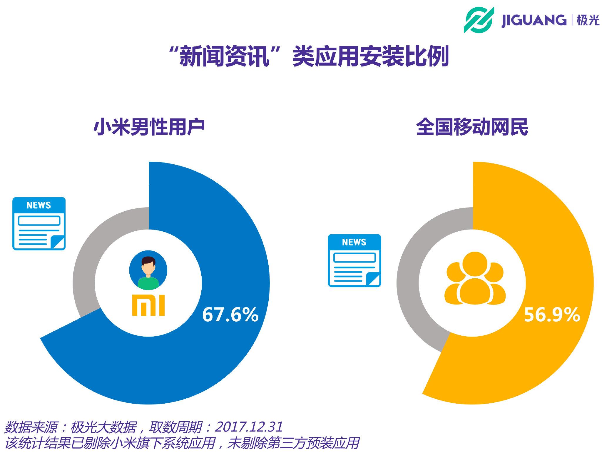 在“新闻资讯”类别应用上,小米男性用户的安装比例为67.6%,该类别应用在全国移动网民中的渗透率则为56.9%。