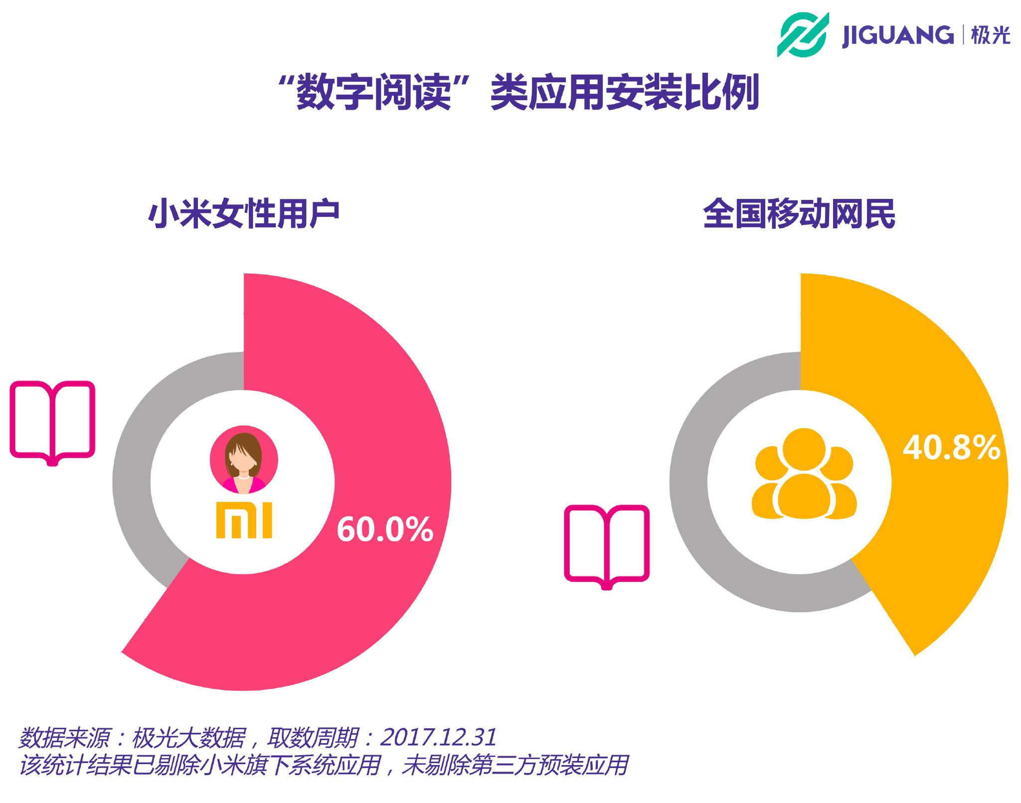 在小米女性用户中,偏好度最高的分别为“数字阅读”、“教育学习”和“社交网络”三类应用。其中“数字阅读”在小米女性用户中的渗透率为60%,比全国移动网民高出19.2%。
