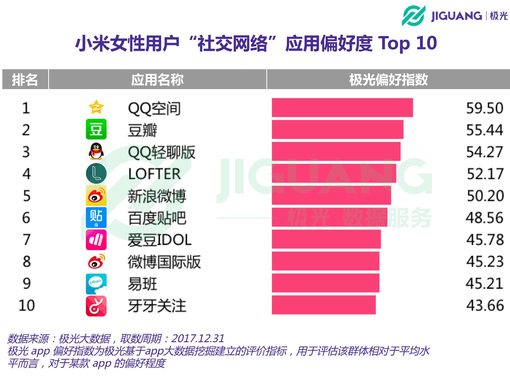 QQ空间、豆瓣和QQ轻聊版依次为小米女性用户偏好度最高的社交类应用,其次为网易旗下的轻博客Lofter以及新浪旗下的微博。
