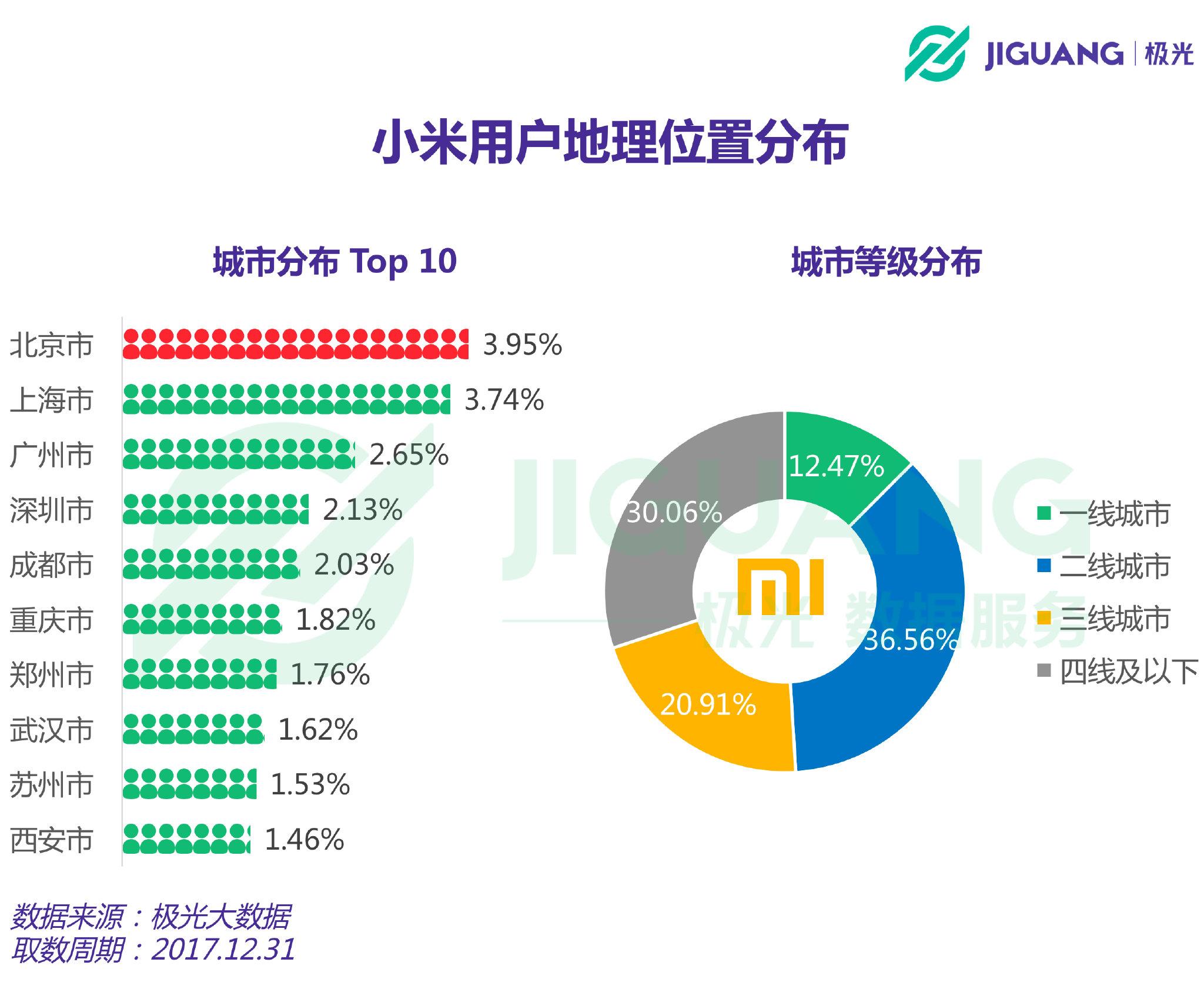 用户地理分布数据显示,有12.47%的小米用户分布在一线城市,三线及以下城市的用户占比为50.97%。除四个一线城市以外,成都、重庆和郑州成小米用户内部占比最高的二线城市。