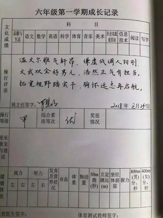日前,一小学六年级教师火了。用七言诗句给学生写评语,字还超美。