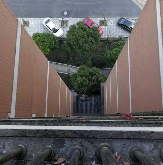 当时这个女孩从15楼的走廊翻出来,掉落在小区楼下的垃圾回收房,把顶棚砸穿,人趴在了黄色油桶上。