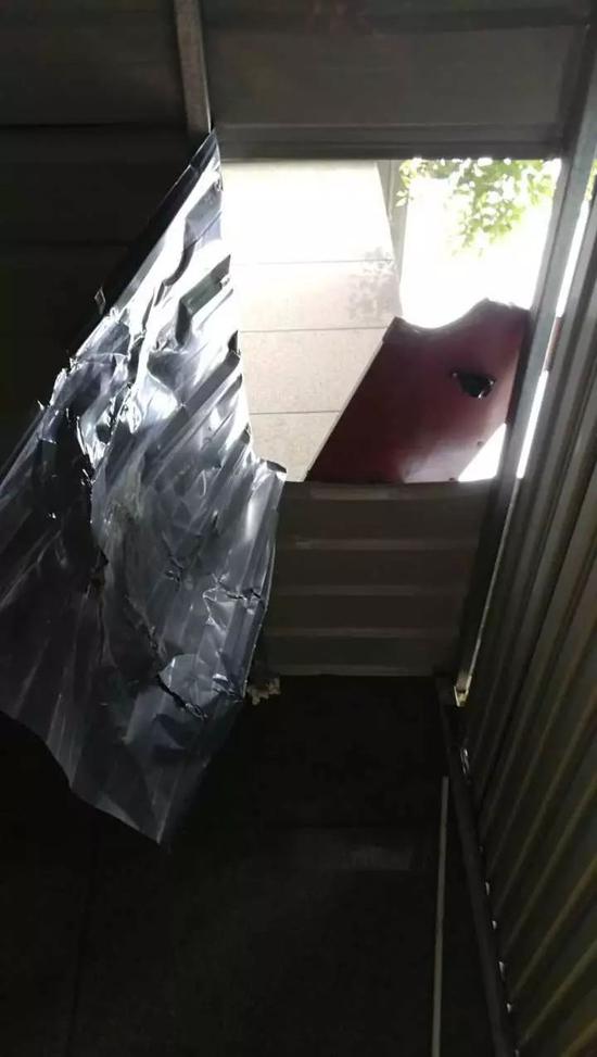在小隔间外面,穿着清洁工制服的大姐告诉记者,保安是在15楼的走廊外面看到有一张凳子,凳子下面还有一双鞋子,他想小孩子会不会是掉下去了,往下一看,果然,杂物间的顶棚被砸了个大洞。他赶忙下来打开卷帘门,小孩子就趴在黄色的油桶上面。