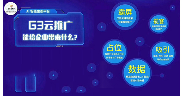 G3云推广全网营销,多种渠道,多种平台,多种推广形式,要流量有流量、要排名有排名、要订单有订单、口碑品牌、诚信包装、一应具有;关键词资源抢投中,先到先得