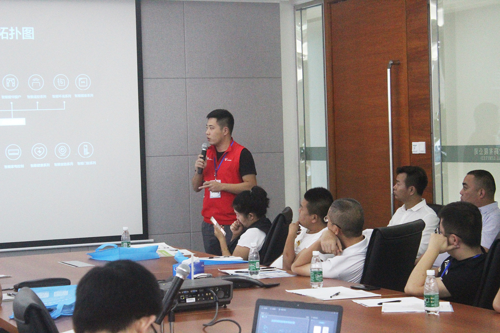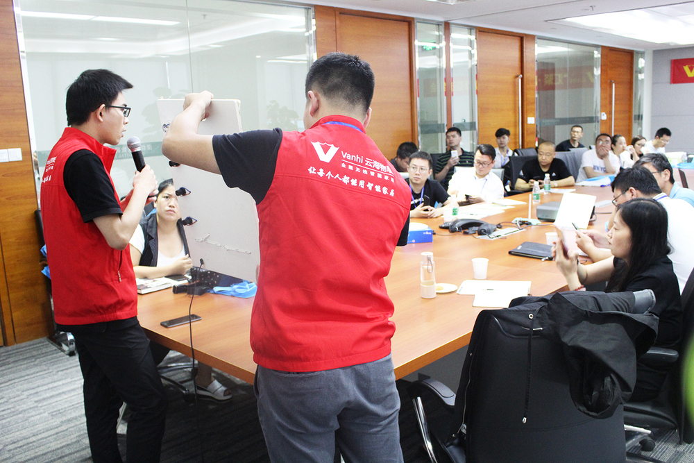 云海物联销售经理徐联芳给加盟商讲解智能家居在每一个细分市场(房地产、办公楼、公寓、家庭等)的推广方式与技巧,真是受益匪浅,接着还介绍了云海物联产品优势分析,招商政策。大家都听得非常投入!