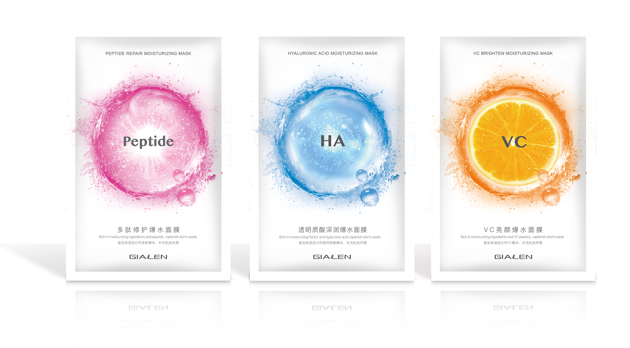 透明质酸深润爆水面膜深层滋润和补水,多肽修护爆水面膜修护和紧致肌肤,VC亮颜爆水面膜帮助提升肌肤亮泽度,三款面膜针对不同肌肤问题,定制解决方案。