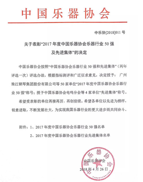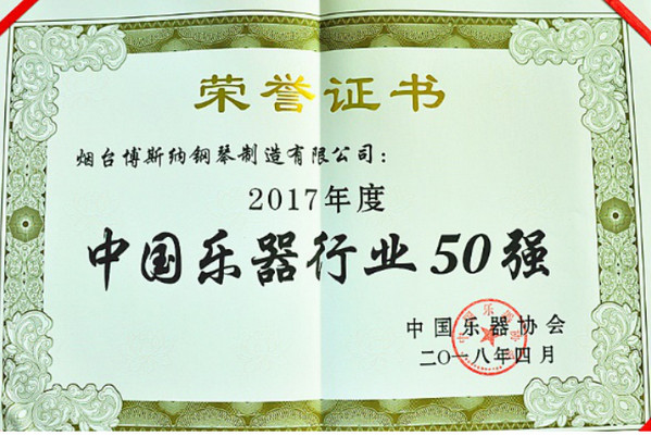 由中国乐器协会审查筛选评定,烟台博斯纳钢琴制造有限公司再次荣获“中国乐器行业50强”称号。