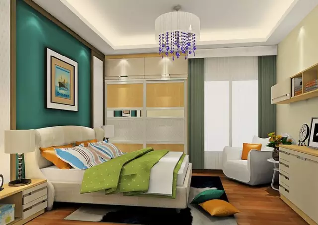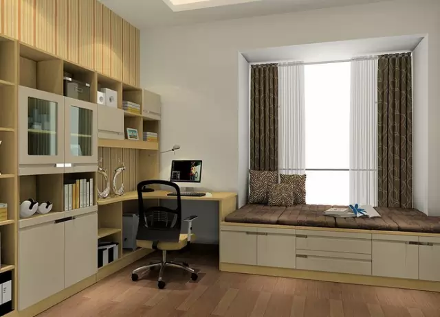 衣柜和书桌、吊柜的拼搭组合,书桌衔接上地台和榻榻米,可当做床踏使用。榻榻米床尾摆放了半高柜和矮柜。