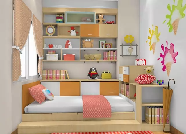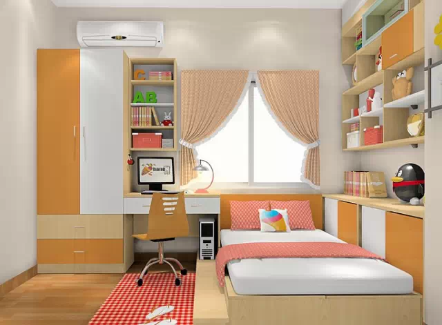 在窗户下设计了书桌和矮柜,增加了供孩子玩耍活动的区域,整体色调以蓝色和黄色为主,适合上小学的男孩。