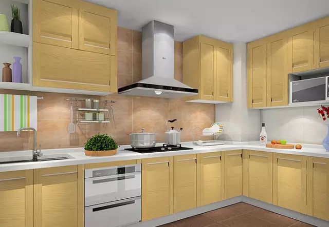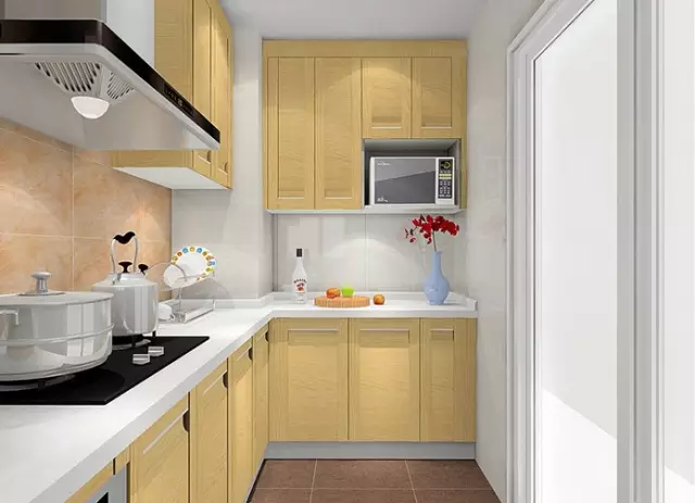 避柱的户型设计,微波炉不用放在台面上占据台面位置,放在吊柜上空间巧利用。