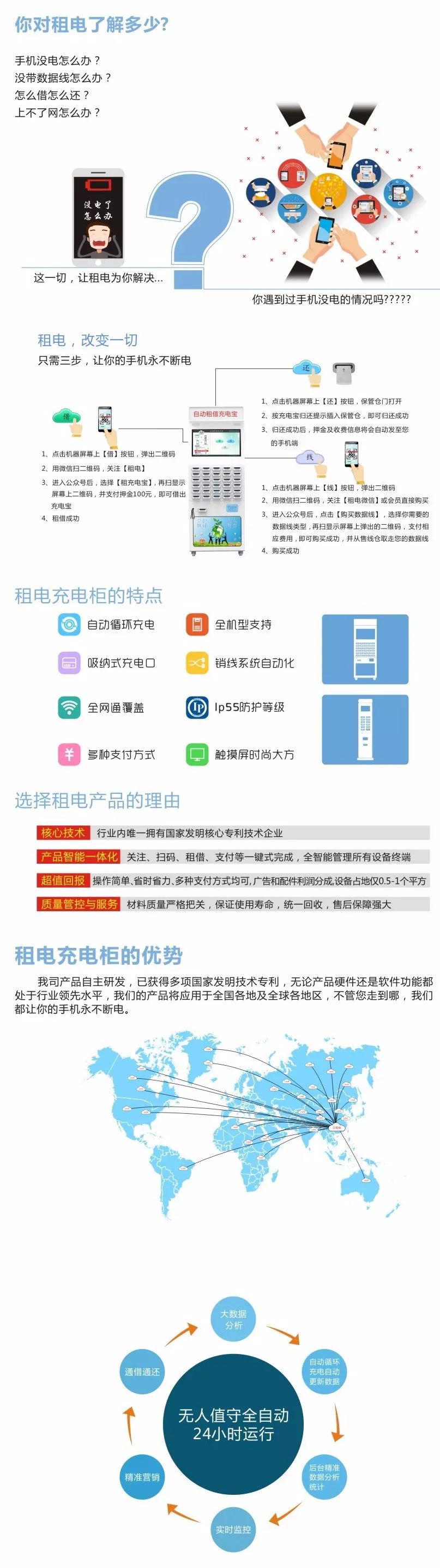 租电自助充电柜是跨时代的一款自助只能充电设备,由充电柜、充电宝和微信公众号、app组成,可以实现随时随地租借和归还充电宝功能。